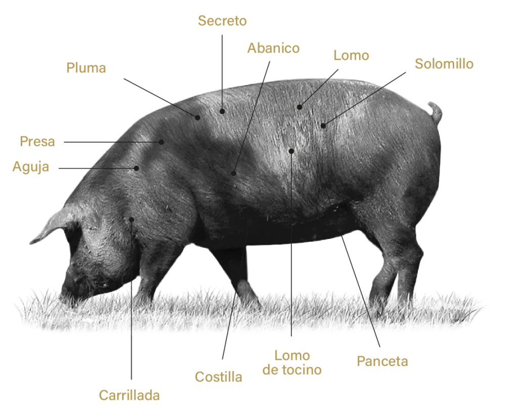 El cerdo ibérico, Sus Ibericus, es una raza única en el mundo, reconocible por sus características físicas singulares. Su crianza tradicional en libertad, sumada a una alimentación basada en recursos naturales como la bellota, dan lugar a una carne de calidad excepcional. En IberiQ, nos especializamos en seleccionar y ofrecer los cortes más representativos y valorados del cerdo ibérico. Desde piezas nobles como el secreto, la presa, el abanico o la pluma, hasta clásicos como el lomo, la panceta, el solomillo, la aguja, y por supuesto, los emblemáticos y exquisitos jamón ibérico y paleta ibérica.