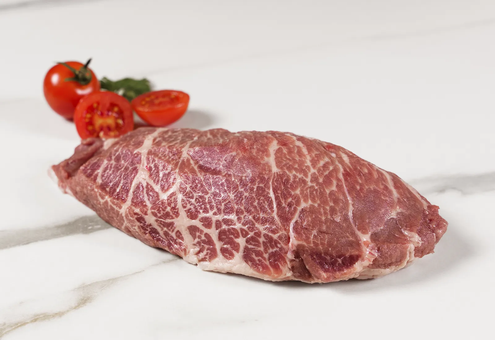 La nobleza suprema de los cortes del cerdo ibérico. Una pieza del tamaño de un puño, suave, de textura agradable y ligera, generosa en su sabor. Es uno de los cortes más apreciados por los cocineros. La presa de paleta o cabeza de lomo es la parte final del músculo del lomo, situada entre el omóplato y los cuartos delanteros del cerdo. La equilibrada infiltración de grasa le atribuye una textura única.